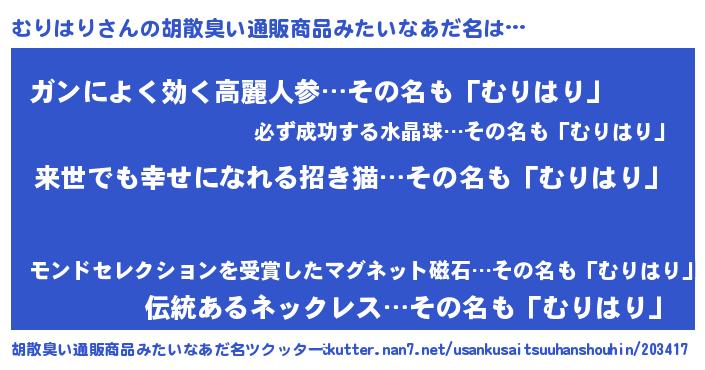 | ヘコむあだ名 | 『むりはり(小並感)』『むりお』 |