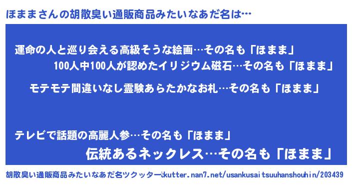 | 欧米人風あだ名 | 『マイケルほまま』『アンジェラ・ほまま』 |