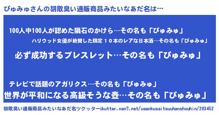 | 男性向けラノベタイトル風あだ名 | 『ピュミュスレイヤー』『ぴゅみゅの憂鬱』 |