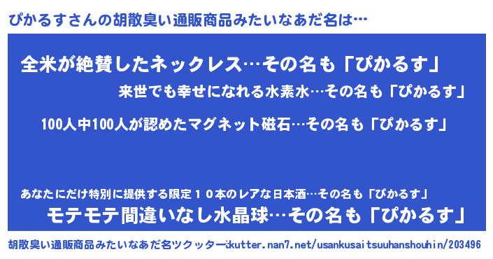 | 男性向けラノベタイトル風あだ名 | 『おまえをオタクにしてやるから、俺をぴかるすにしてくれ! 』 |