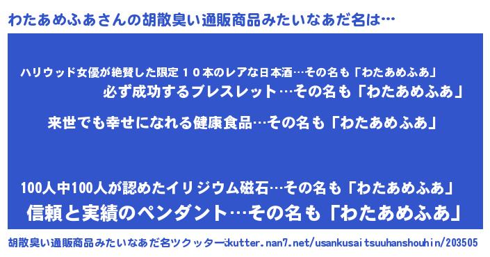 | ヘコむあだ名 | 『わたあめふあ(笑)』『わた太郎』 |