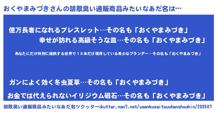 | 男性向けラノベタイトル風あだ名 | 『この素晴らしい世界におくやまみづきを!』 |