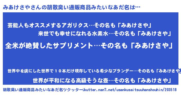 | 意味不明あだ名 | 『とにかく怪しいみあけさや』 |