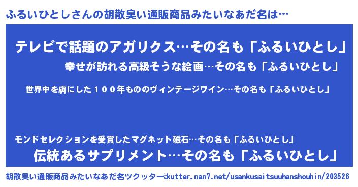 | 男性向けラノベタイトル風あだ名 | 『この素晴らしい世界にふるいひとしを!』 |