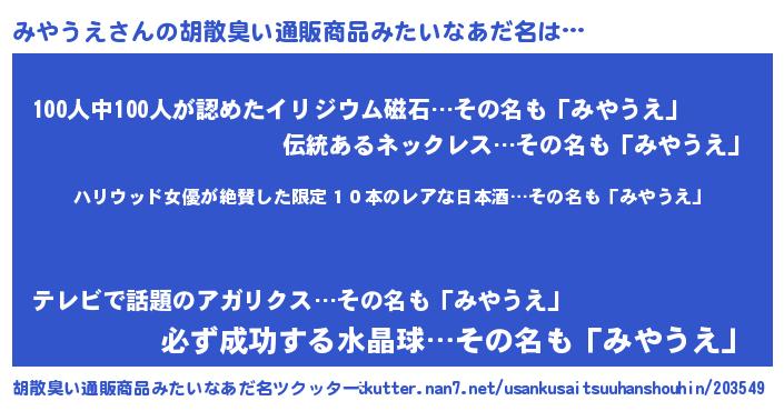 | 意味不明あだ名 | 『住所不定無職みやうえ(65歳)』 |