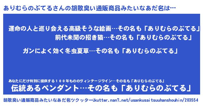 | 女子向けラノベタイトル風あだ名 | 『ありむらのぶてるなんてお断りですっ。』 |