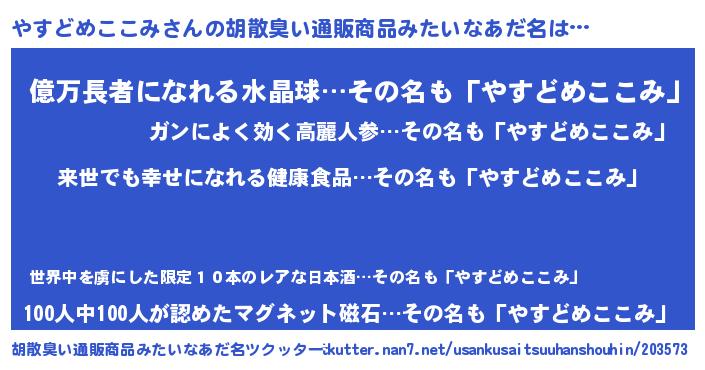 ヘコむあだ名 | 『やすどめここみ(爆)』『やすにゅー』 |