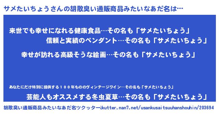 | 欧米人風あだ名 | 『サメたいちょうクリステル』 |
