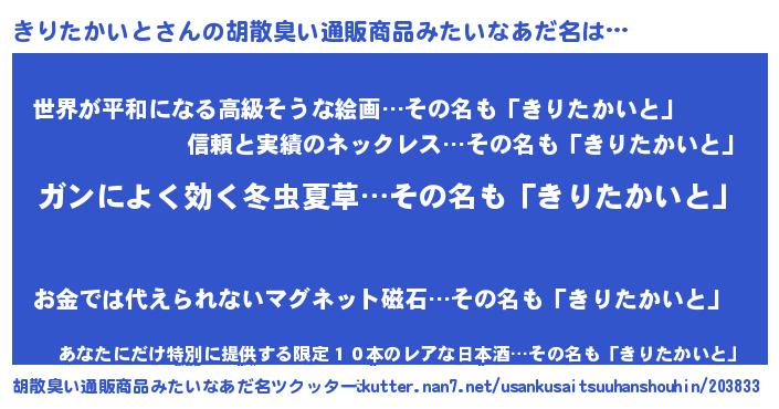 | 女子向けラノベタイトル風あだ名 | 『きりたかいとなんてお断りですっ。』 |