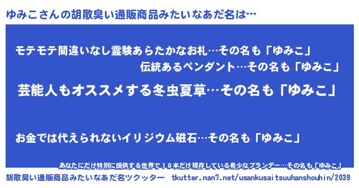 | ピコ太郎風あだ名 | 『ユコ六郎』『ユミ八郎』『ユユ太郎』 |