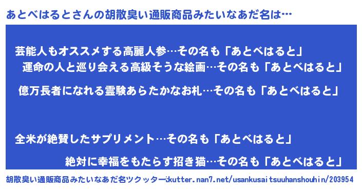 | 恥ずかしいあだ名 | 『プリティーあとべはると』『あとちん』 |