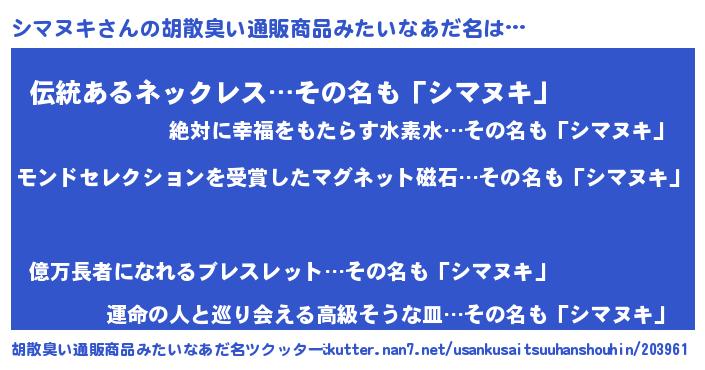 | 男性向けラノベタイトル風あだ名 | 『ノーゲーム・ノーシマヌキ』 |