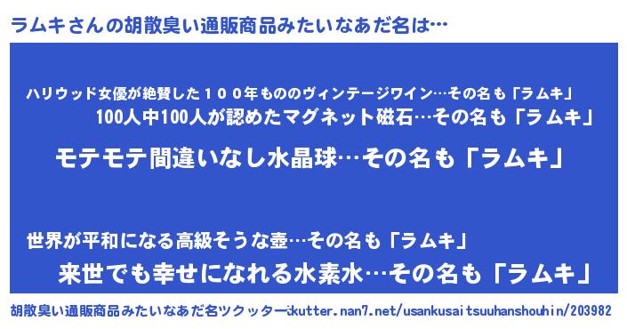 | 男性向けラノベタイトル風あだ名 | 『ラムキの憂鬱』『ラムキスレイヤー』 |
