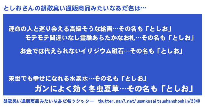 | 意味不明あだ名 | 『眠気覚ましガムとしお味』『自称としお』 |