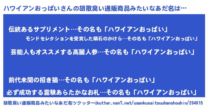 ハワイアンおっぱいさんの胡散臭い通販商品みたいなあだ名をツクッター!