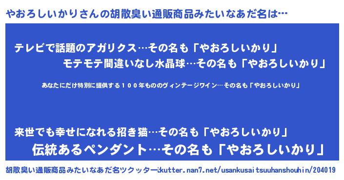 | 意味不明あだ名 | 『住所不定無職やおろしいかり(11歳)』 |