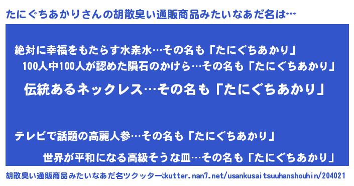 | 女子向けラノベタイトル風あだ名 | 『たにぐちあかりの卵を拾いまして』 |