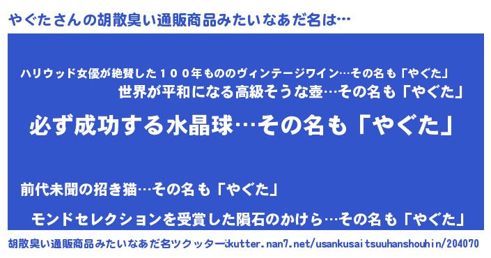 | 男性向けラノベタイトル風あだ名 | 『やぐたの憂鬱』『ヤグタスレイヤー』 |