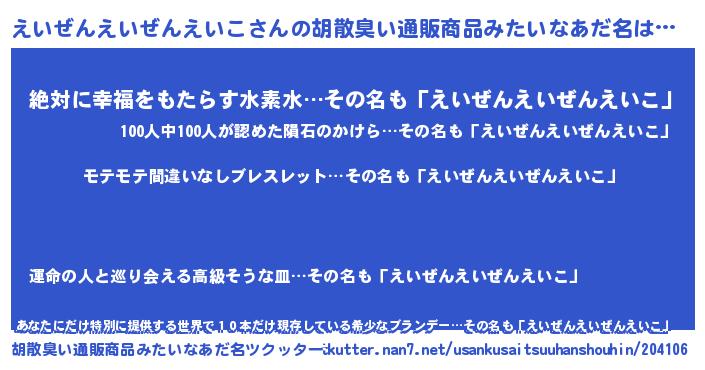 | 男性向けラノベタイトル風あだ名 | 『えいぜんえいぜんえいこの憂鬱』 |
