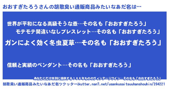 | 男性向けラノベタイトル風あだ名 | 『魔法科高校のおおすぎたろう』 |