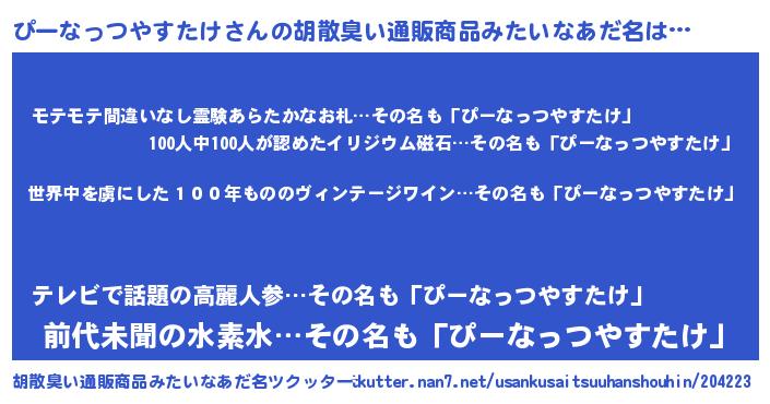 | 男性向けラノベタイトル風あだ名 | 『転生したらぴーなっつやすたけだった件』 |