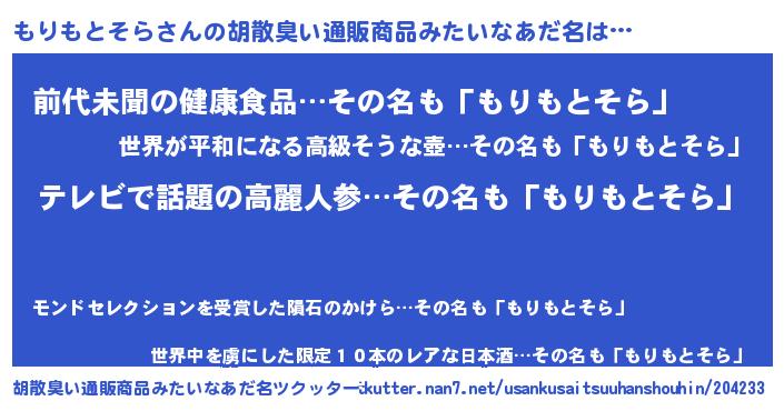 | 意味不明あだ名 | 『自称もりもとそら』 |