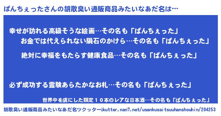 | 男性向けラノベタイトル風あだ名 | 『ぱんちぇったという概念が存在しない退屈な世界 』 |