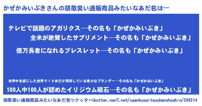 | 男性向けラノベタイトル風あだ名 | 『カゼカミイブキアートオンライン』 |