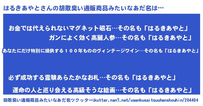 | 男性向けラノベタイトル風あだ名 | 『うちのはるきあやとが世界を掌握している!』 |