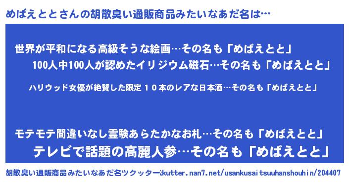 | 意味不明あだ名 | 『住所不定無職めばえとと(56歳)』 |