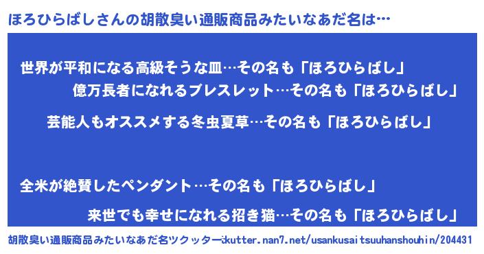 | 男性向けラノベタイトル風あだ名 | 『Re:ほろひらばしから始める異世界生活』 |