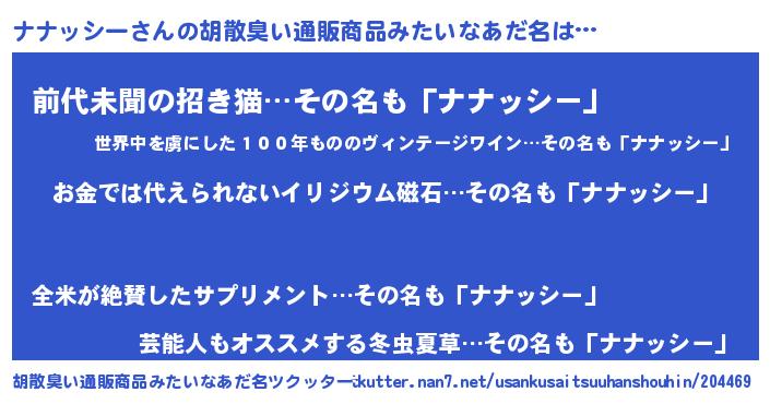| 男性向けラノベタイトル風あだ名 | 『転生したらナナッシーだった件』 |