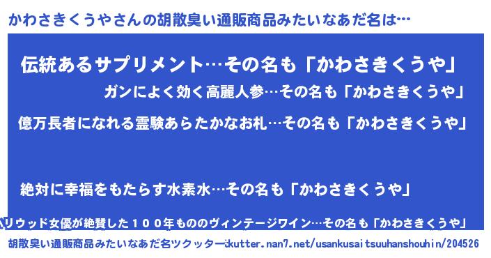 | 男性向けラノベタイトル風あだ名 | 『カワサキクウヤアートオンライン』 |