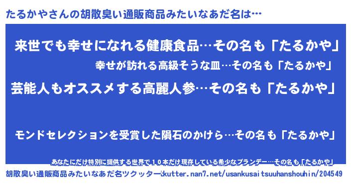 | 意味不明あだ名 | 『自称たるかや』『永久保存たるかや』 |