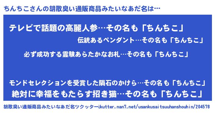 | 男性向けラノベタイトル風あだ名 | 『ちんちこの憂鬱』 |