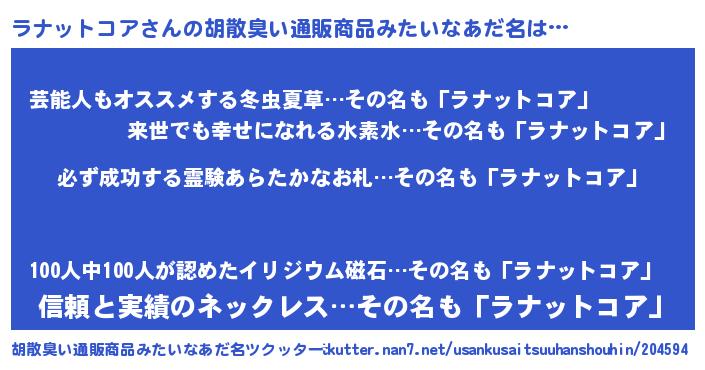| ヘコむあだ名 | 『ラナもー』『ラナを』『なまこ酢』 |