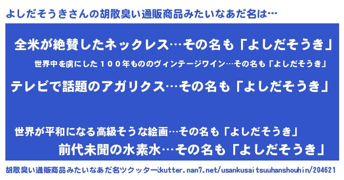 | 意味不明あだ名 | 『自称よしだそうき』 |
