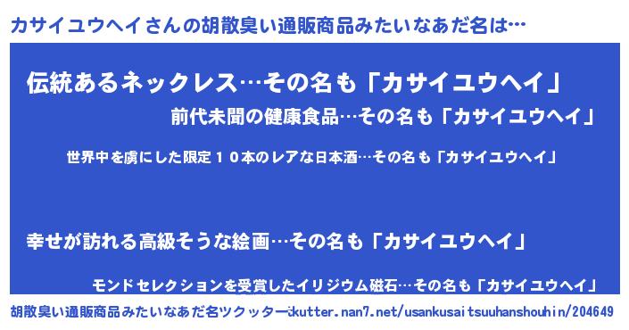 | 意味不明あだ名 | 『住所不定無職カサイユウヘイ(50歳)』 |