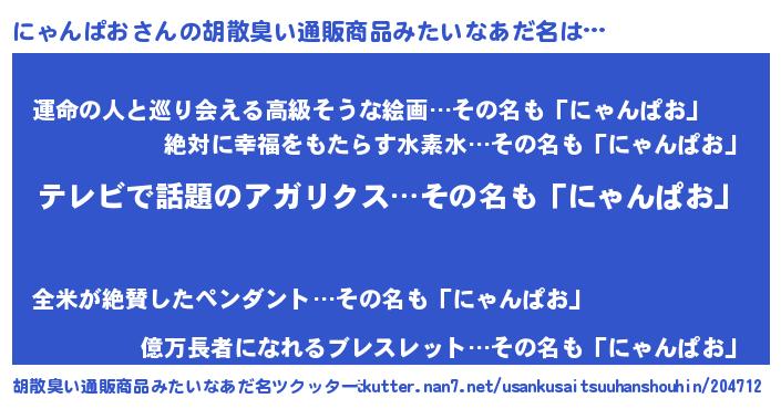 | 男性向けラノベタイトル風あだ名 | 『Re:にゃんぱおから始める異世界生活』 |