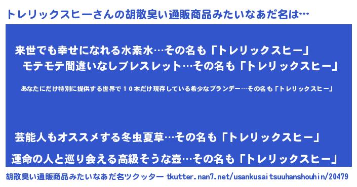 | 男性向けラノベタイトル風あだ名 | 『この素晴らしい世界にトレリックスヒーを!』 |