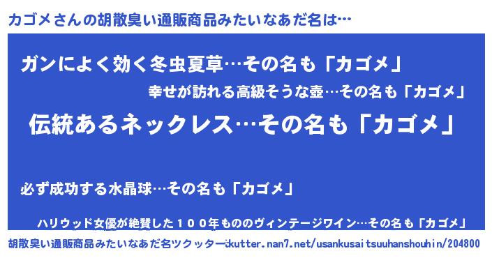 | 男性向けラノベタイトル風あだ名 | 『カゴメの嫁は女の子じゃないと思った?』 |