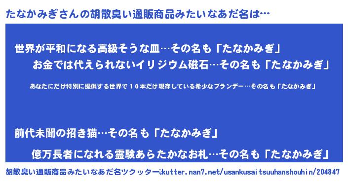 | 男性向けラノベタイトル風あだ名 | 『この素晴らしい世界にたなかみぎを!』 |