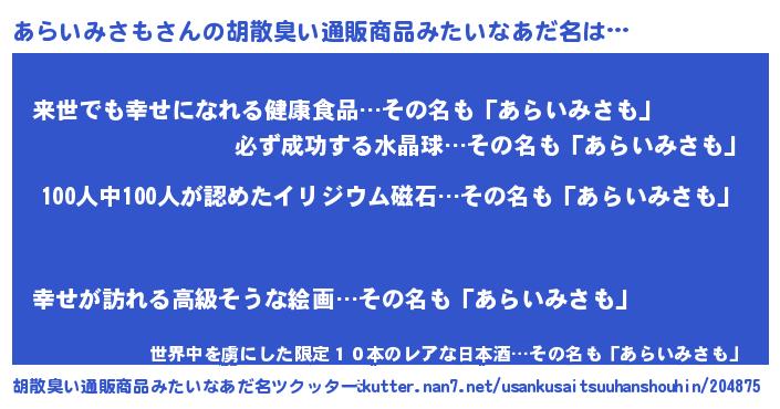 | 男性向けラノベタイトル風あだ名 | 『おまえをオタクにしてやるから、俺をあらいみさもにしてくれ! 』 |