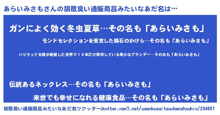 | 意味不明あだ名 | 『住所不定無職あらいみさも(85歳)』 |