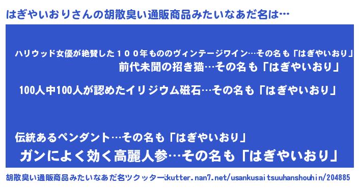 | 男性向けラノベタイトル風あだ名 | 『おまえをオタクにしてやるから、俺をはぎやいおりにしてくれ! 』 |