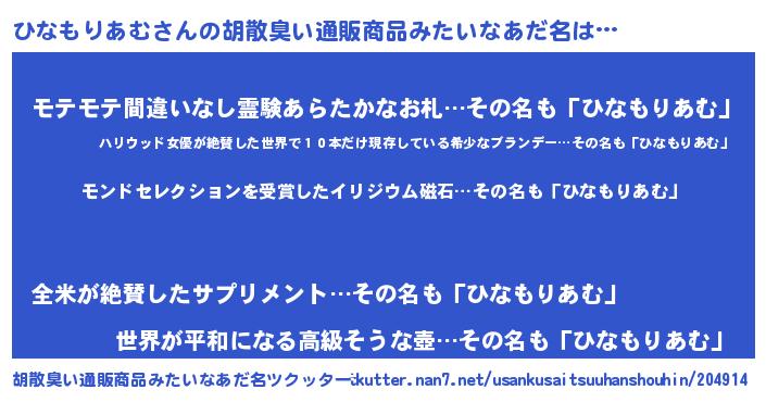 | 男性向けラノベタイトル風あだ名 | 『ノーゲーム・ノーヒナモリアム』 |