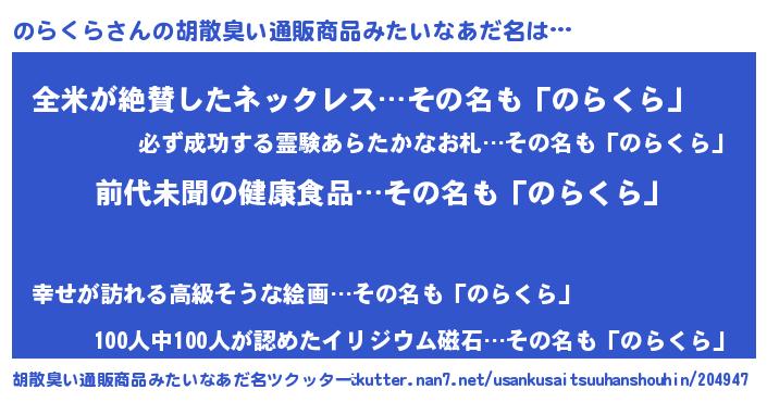 | 男性向けラノベタイトル風あだ名 | 『のらくらに滅ぼされるだけの簡単なお仕事です』 |