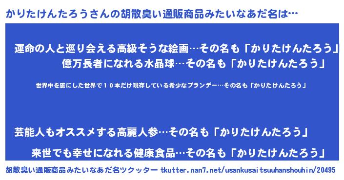 | 意味不明あだ名 | 『住所不定無職かりたけんたろう(95歳)』 |