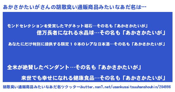 | ヘコむあだ名 | 『あかさかたいが(笑)』『あかもー』 |
