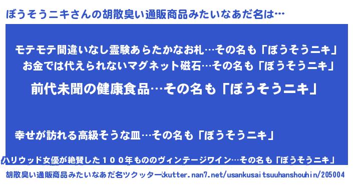 男性向けラノベタイトル風あだ名 | 『ぼうそうニキ~年齢イコール彼女いない歴の魔法使い~』 |